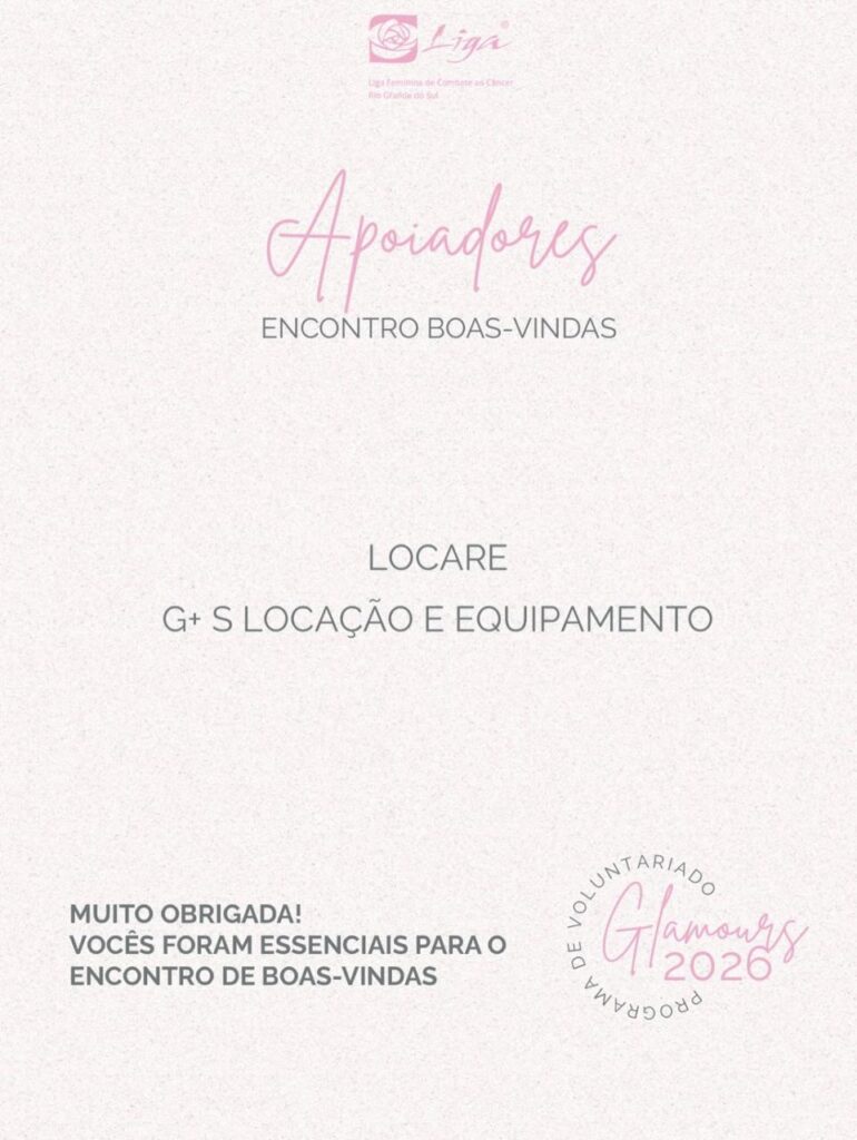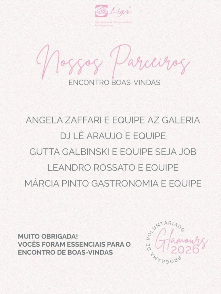 A Liga Feminina de Combate ao Câncer no Rio Grande do Sul promove, no dia 11 de março, às 18h, o Encontro de Boas-Vindas do Programa de Voluntariado Liga Jovem: Glamours 2026. O evento será realizado na AZ Galeria e marca o início de um novo ciclo de atividades do voluntariado jovem da instituição.